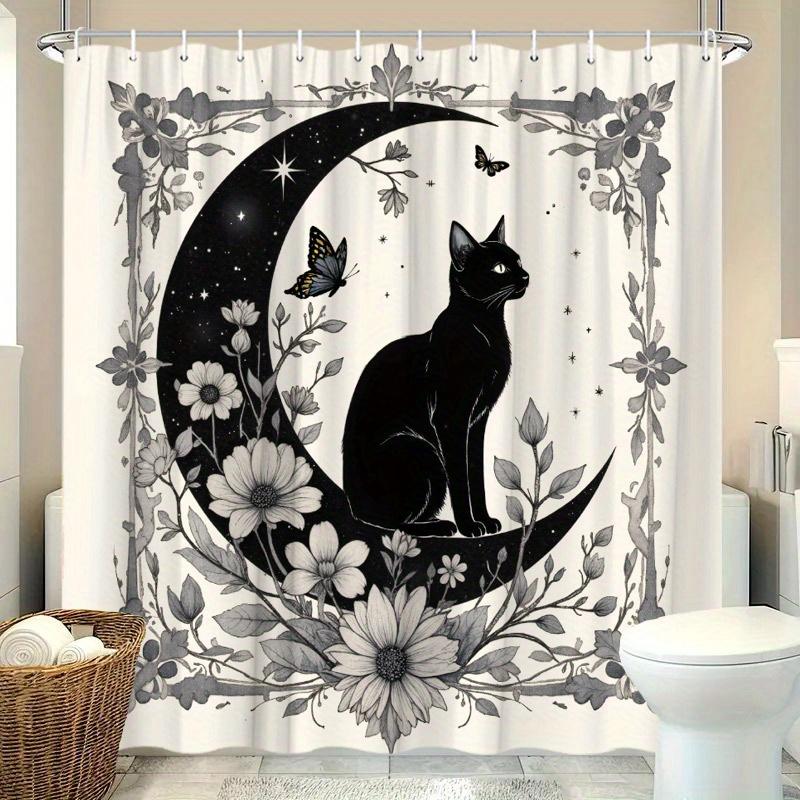 Mystical Black Cat on Crescent Moon Shower Curtain - Water-Resistant Fabric for Bathroom - Ideal for Gothic