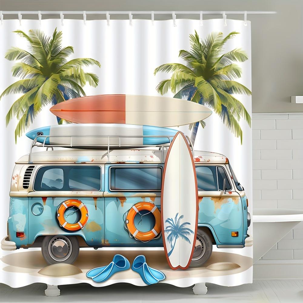 Beach buggy and surfboard shower curtains for bathroom decoration, perfect for adding coastal charm and atmosphere