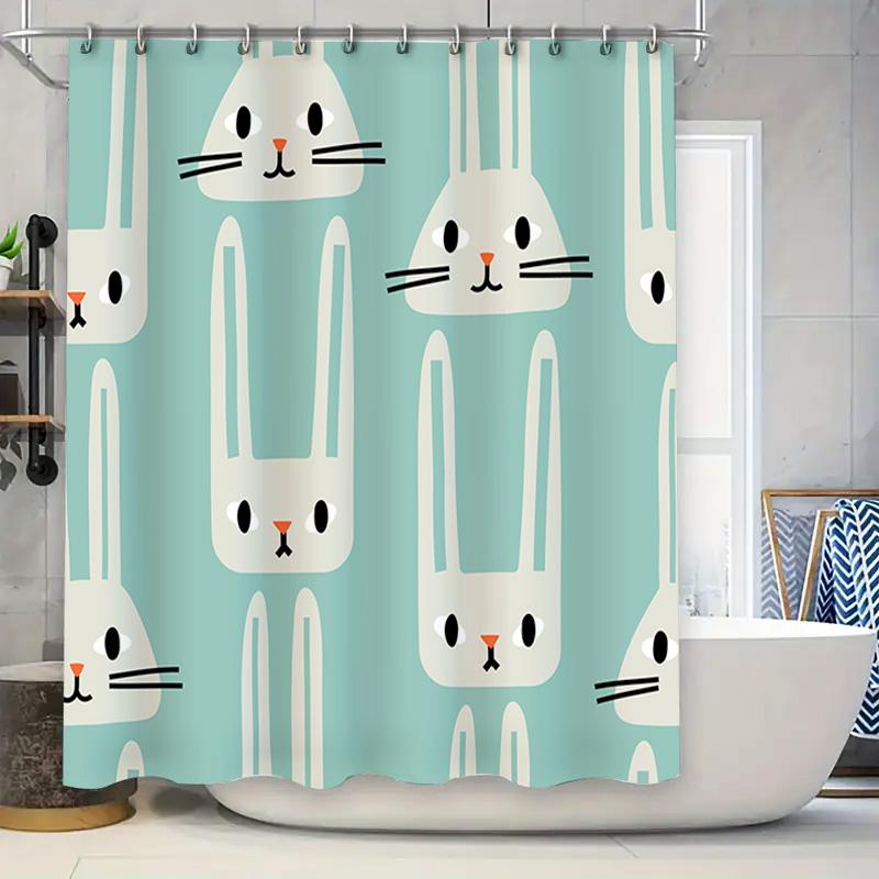 Adorable bunny print shower curtain for bathroom decoration washable fabric, waterproof design suitable for home use.