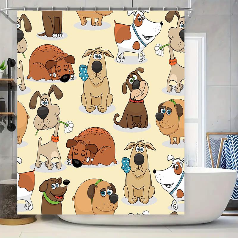 Colorful Cartoon Dog Print Shower Curtain for Bathroom Decor Home Decoration Waterproof Washable Yellow Background
