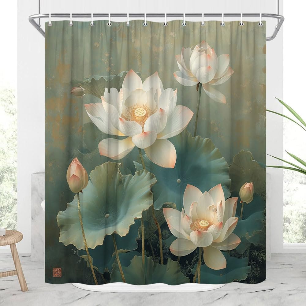 Asian Lotus Floral Shower Curtain Rustic Zen Vintage White Flowers Farmhouse Chinese Japanese Style Relax Plants Green Leaves