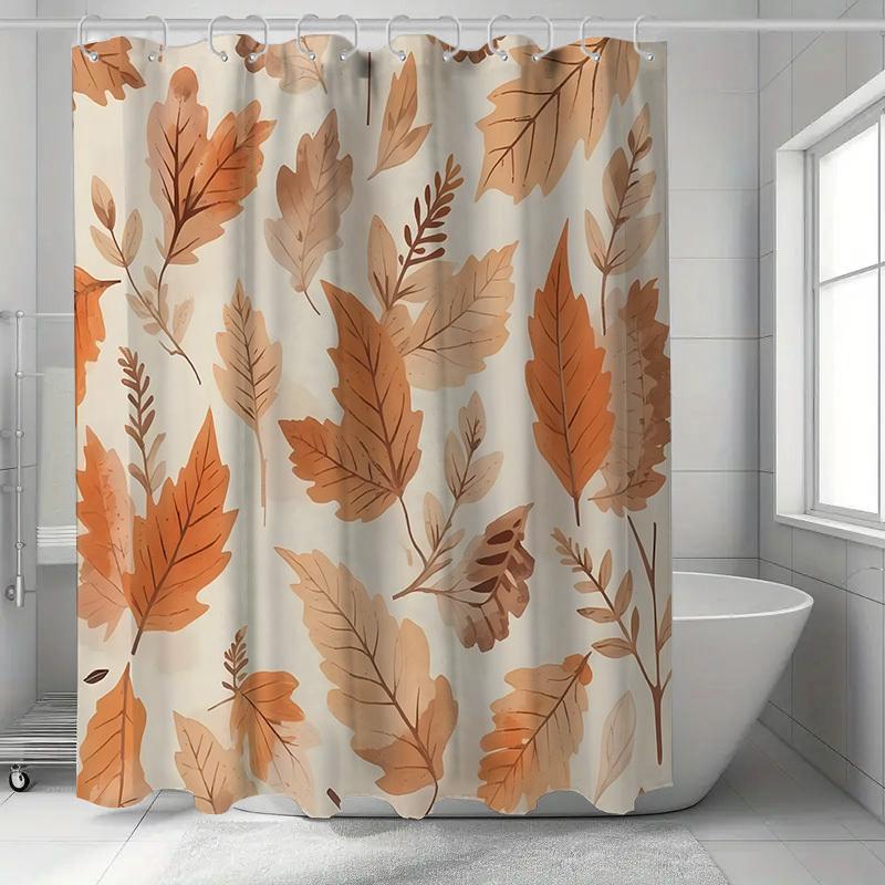 1pc Modern brown leaf pattern shower curtain, polyester fabric, with hooks, machine washable, suitable for bathroom décor.