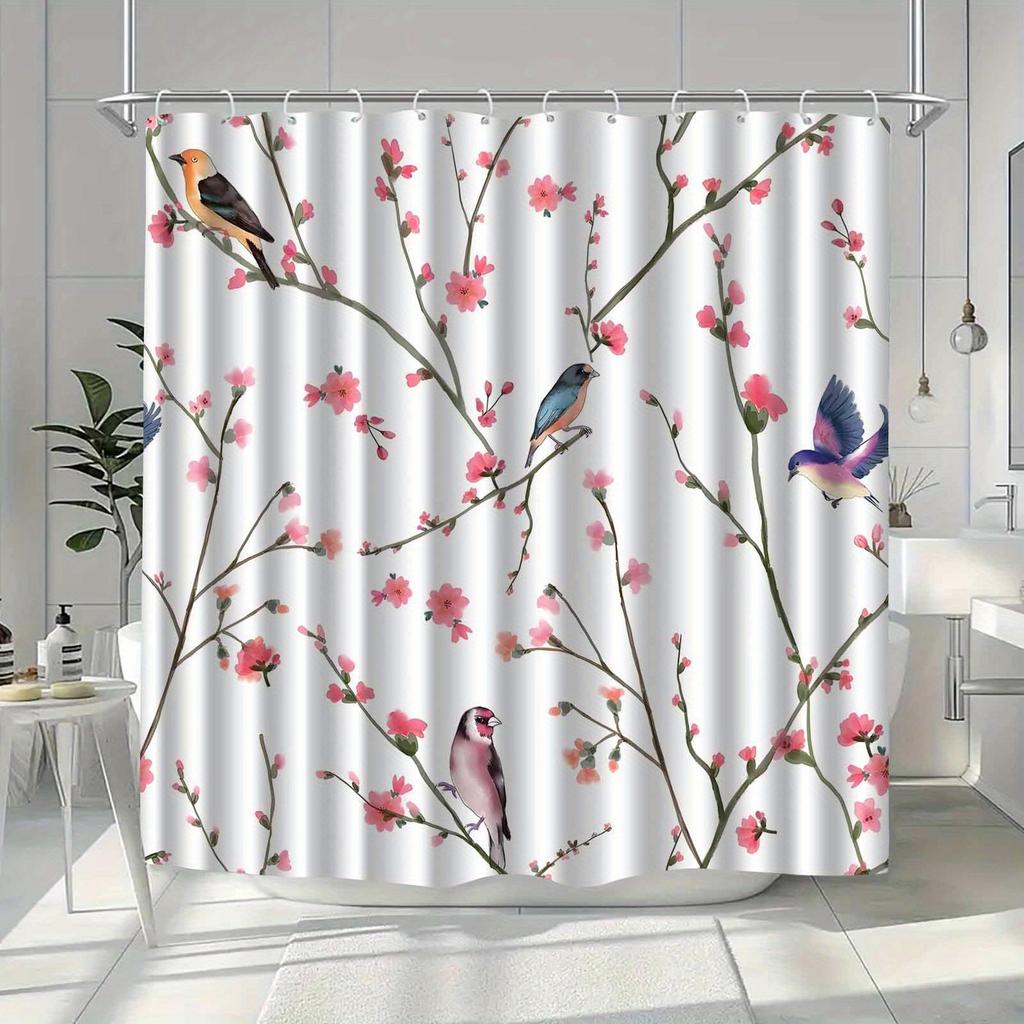 1pc simple floral and bird pattern shower curtain, polyester fabric, machine washable, suitable for bathroom decoration