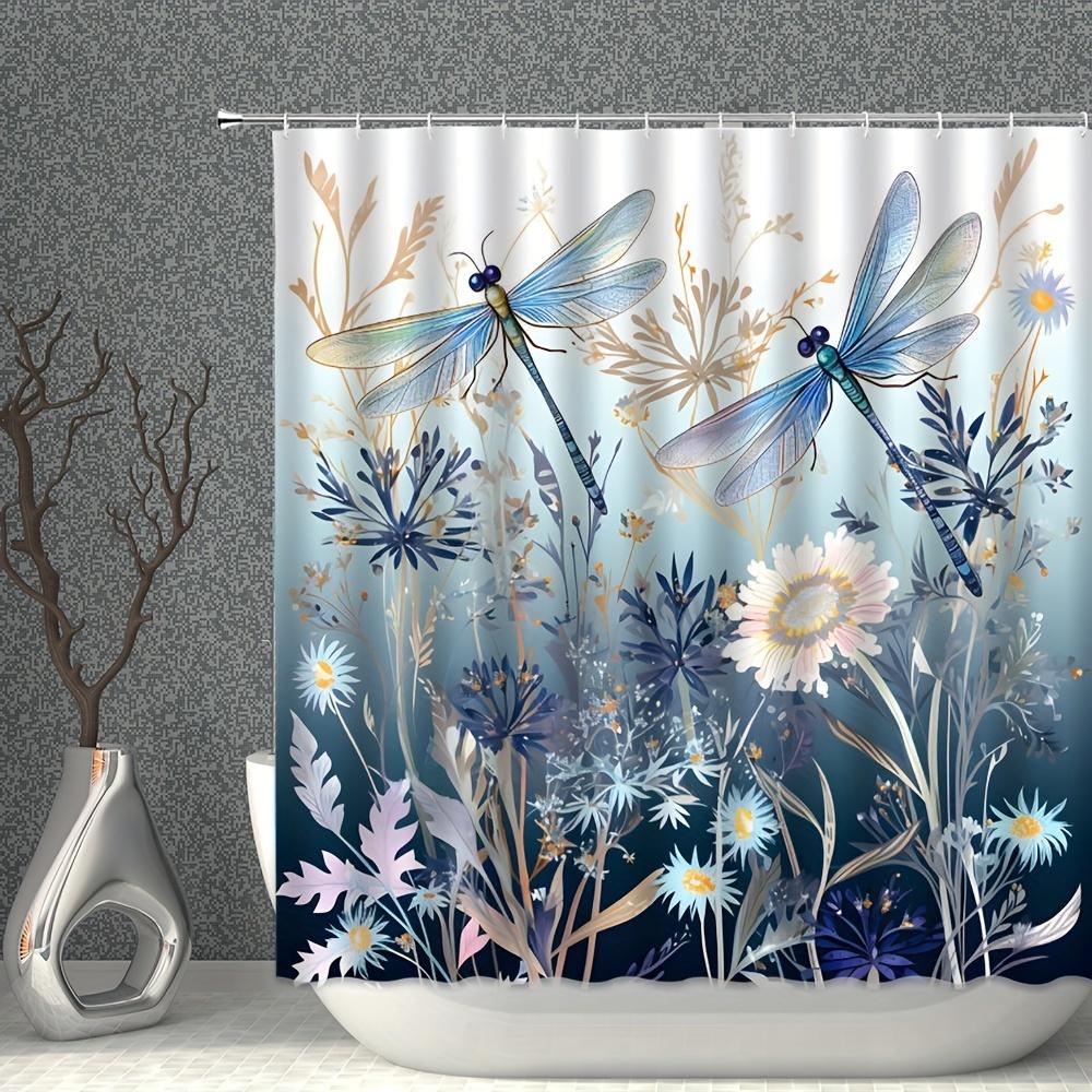 1pc Dragonfly Floral Pattern Shower Curtain, Shower Curtain with Hooks, Bathtub Partition, Bathroom Decor, Bathroom Accessories