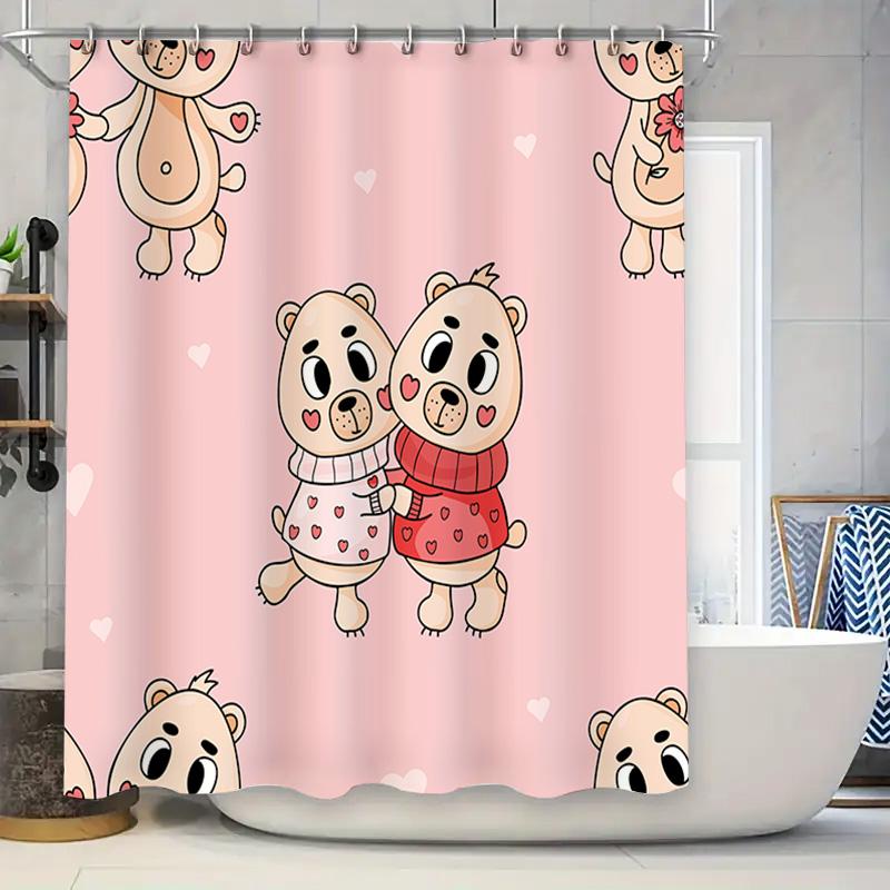 Adorable Cartoon Bear Print Shower Curtain for Kids Bathroom Decor, Pink Color with Hearts Design, Durable Fabric Waterproof Sho