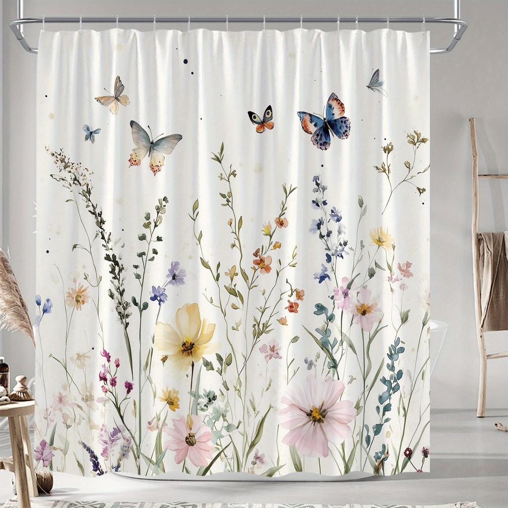 Floral Meadow Shower Curtain with Butterflies - Watercolor Polyester, 70.8x70.8In, Fashion Bath Decor, Includes 12 Hooks