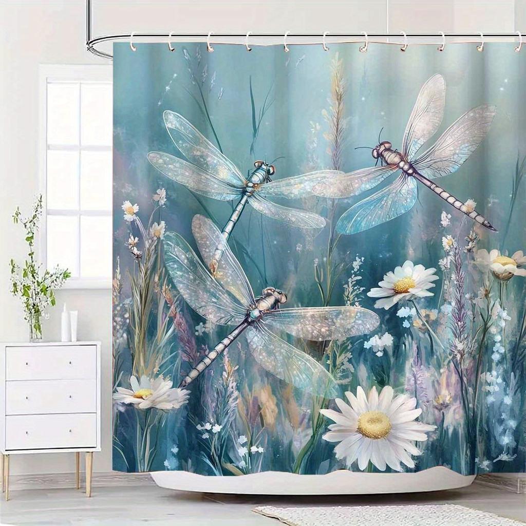 1pc Elegant Dragonfly & Daisy Shower Curtain - Forest Theme, Waterproof Polyester, 12 Hooks, Machine Washable, All-Season Use