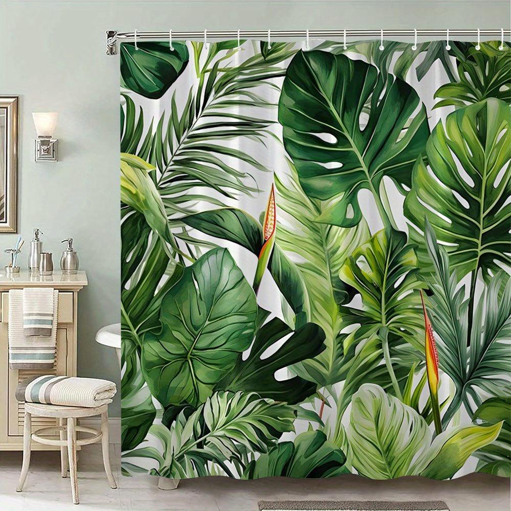 1pc Tropical Leaves Shower Curtain , Polyester,12 Hooks, Monstera, Banana, Elephant Ear, Bird's-Foot Clover Design