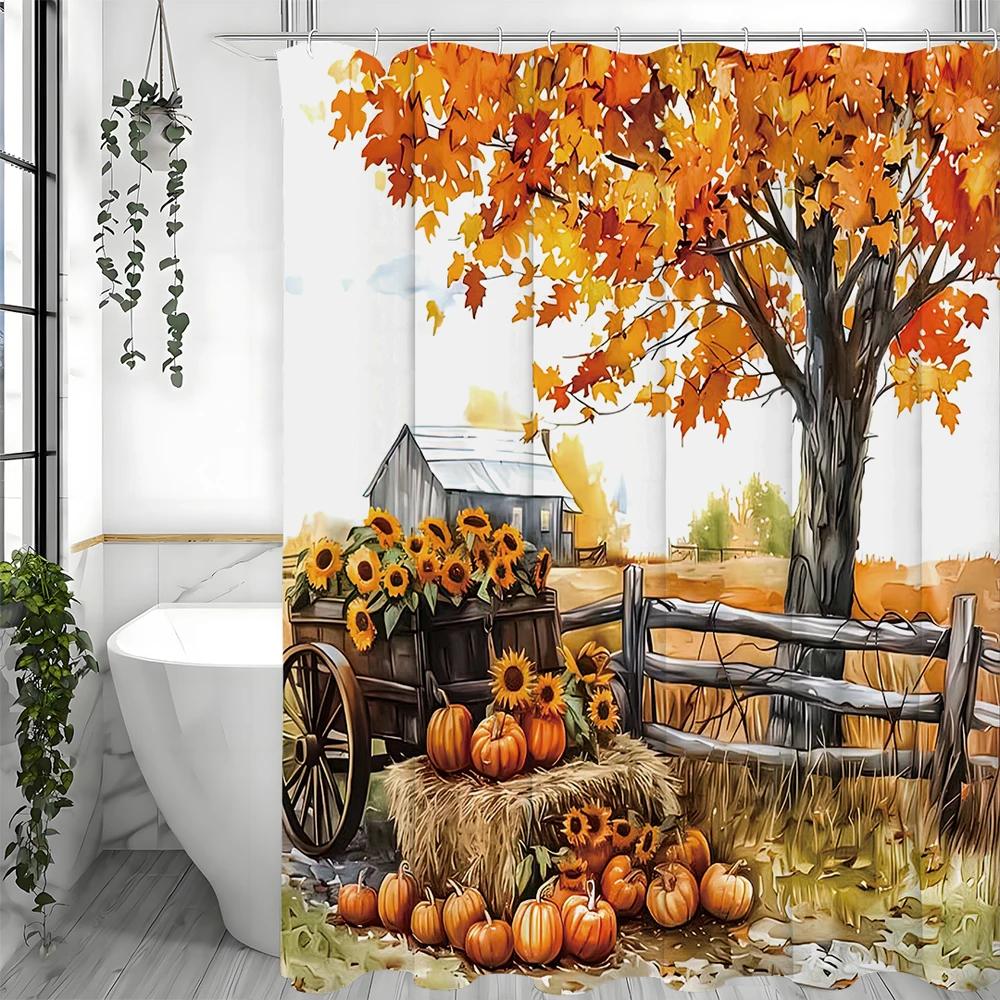 Fall Harvest Farm Pumpkin Sunflower Maple Shower Curtain, Bathroom Decorative Shower Curtain, Waterproof Shower Curtain with Hoo