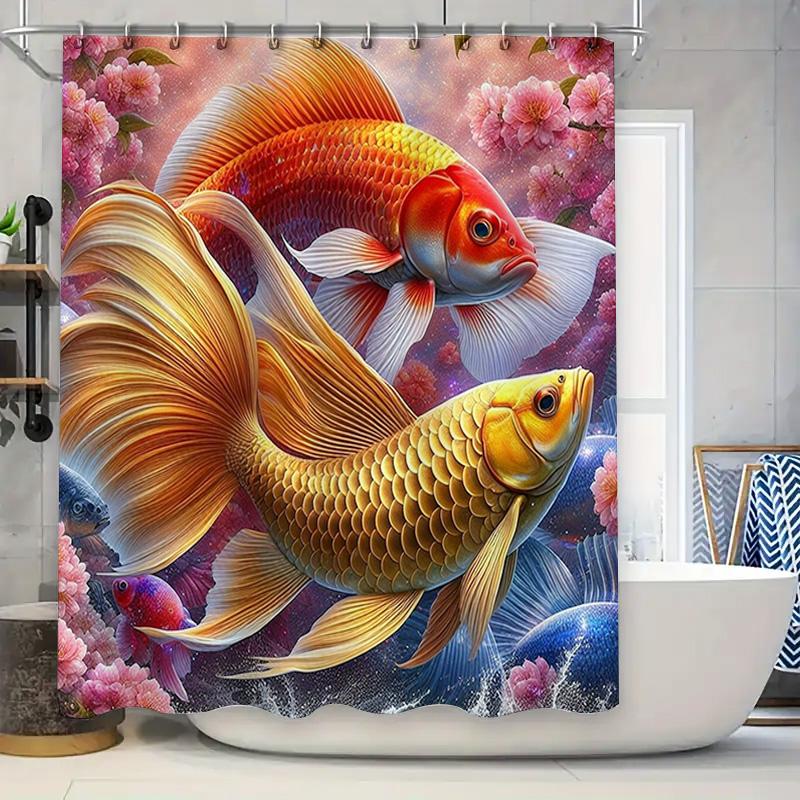 Goldfish Shower Curtain Wall Deco with Pink Blossoms Bath Decor Artistic Waterproof Print Home Decoration 3D Fabric Shower Panel