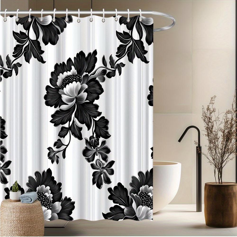 Czarno-biała zasłona prysznicowa z motywem peonii - Elegancka dekoracja łazienki z 12 haczykami