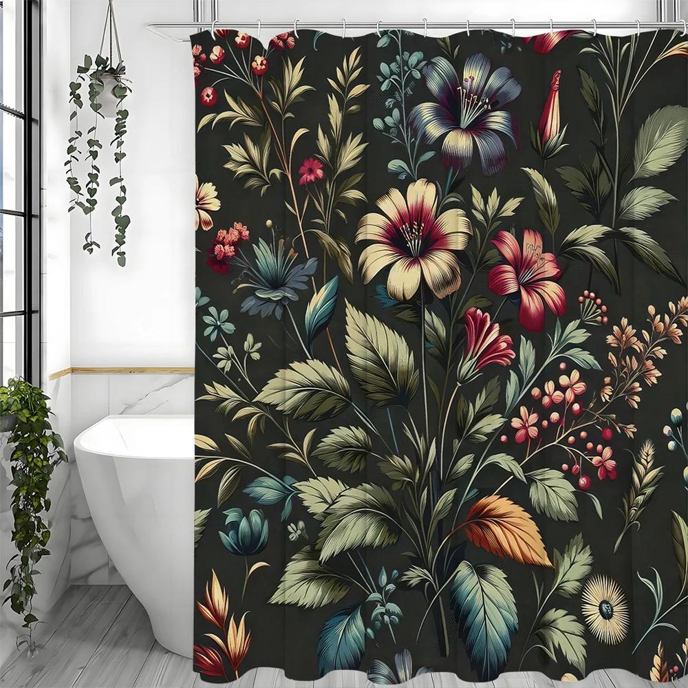 Zasłona Prysznicowa w Kwiaty, Rośliny Kwiatowe, Zielone Tło Dekoracyjna Zasłona Prysznicowa do Łazienki, Wodoodporna Zasłona Prysznicowa z Haczykami