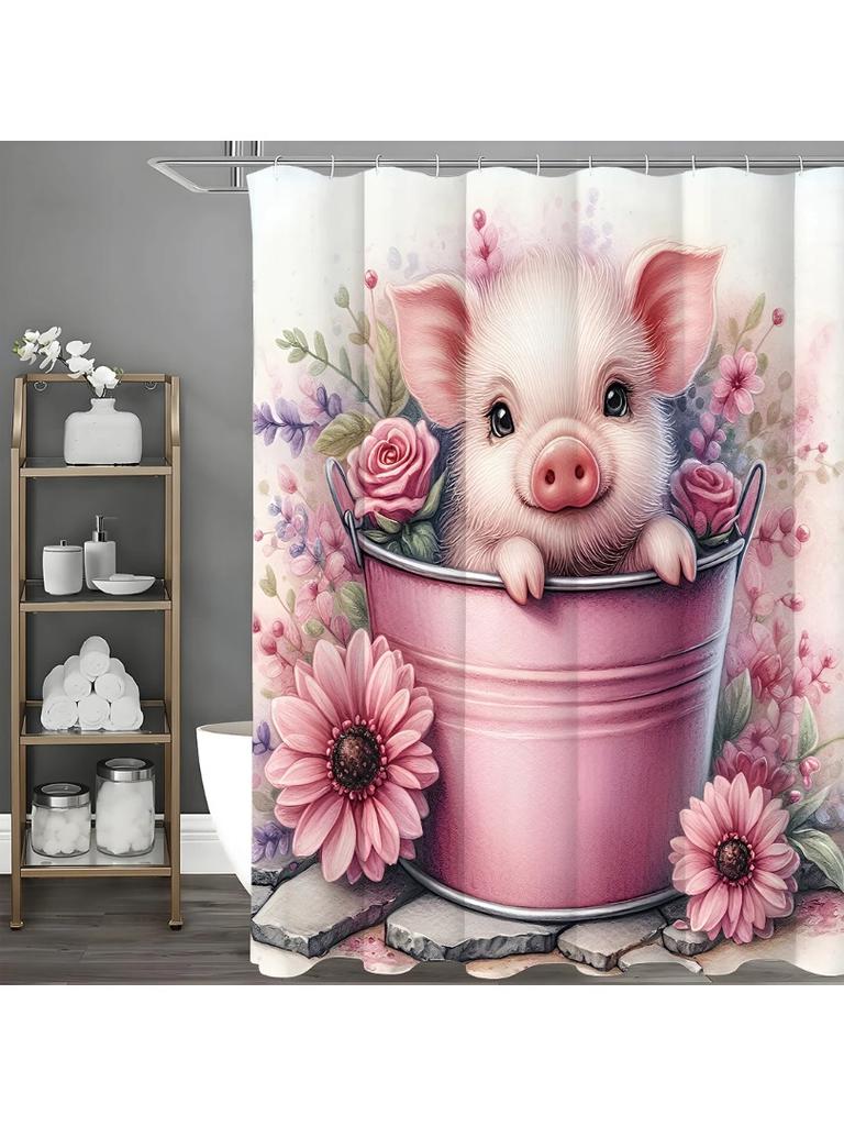 Piggy Floral Shower Curtain in Pink Ironton, Bathroom Decorative Shower Curtain, Waterproof Shower Curtain with Hooks
