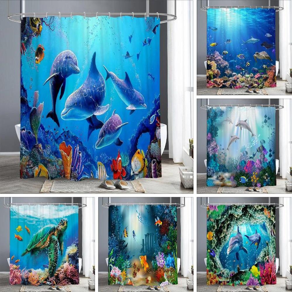 Zwierzęta Oceanu Zasłony Prysznicowe Delfin Żółw Morski Ryby Koral Jaskinia Podwodna Sceneria Tkanina Zasłona Kąpielowa dla Dzieci Wystrój Łazienki