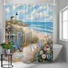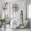 Coastal Lighthouse Shower Curtain, Beach Theme Shower Curtain with Blue Wooden Boats and Seagulls, Bathroom Decor with Hooks