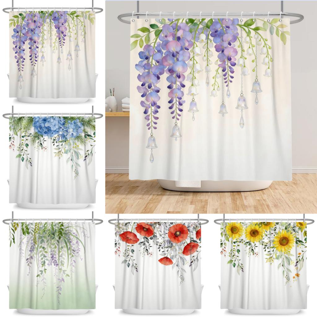 Watercolor Floral Shower Curtain Leaves Flowers Waterproof Bath Curtain For Bathroom Decor Polyester Fabric With Hooks Included
