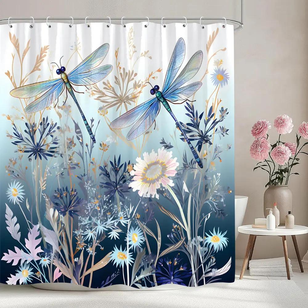 Dragonfly Pattern Printed Shower Curtain Watercolour Painting Botanical Flower Art Creative Fabric Shower Curtains Bathroom Deco