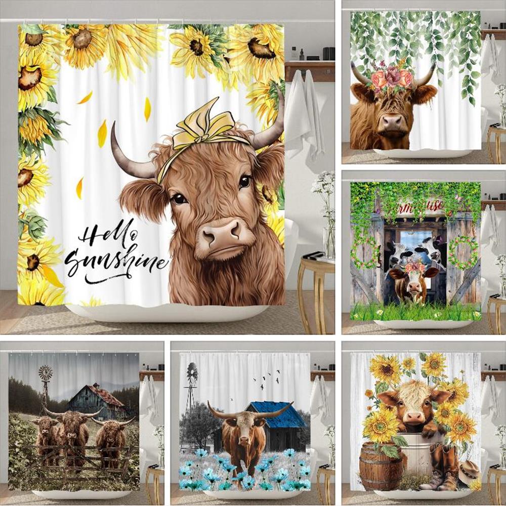 Highland Cow Shower Curtain Farmhouse Funny Bull Rustic Western Watercolor Spring Florral Cute Animal Plant Kids Bathroom Decor