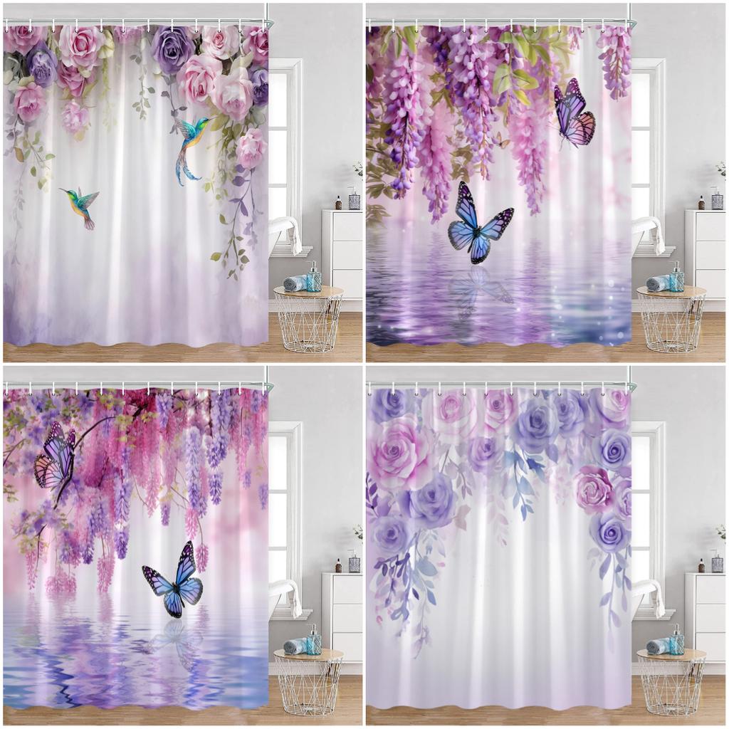 Purple Flowers Shower Curtains Wisteria Lavender Butterfly Birds Pirple Floral Bathroom Decorations Modern Elegant Bath Curtain