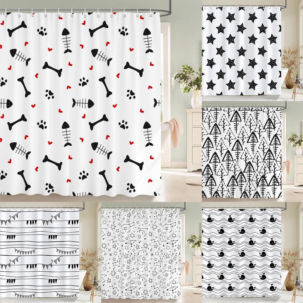 Black and White Simple Cartoon Shower Curtain Washable Polyester Bathroom Curtains Decor Bathtub Partition Curtain With Hooks