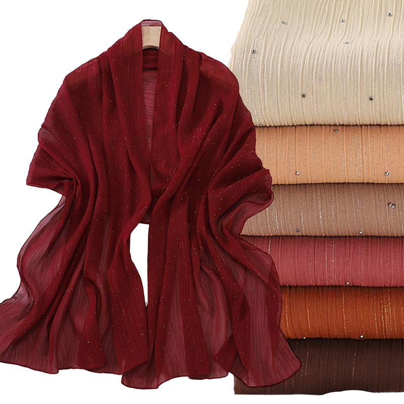 Spring Plain Wrinkle Rhinestone Shiny Shimmer Shawls Scarf for Women Ramadan High Quality Wrap Beach Stole Bufandas Muslim Hijab