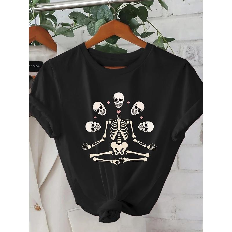 Women Black White Skeleton Print T-Shirt Crew Neck Short Sleeve Lightweight Summer Casual Top