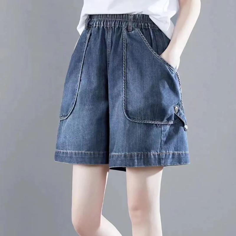 Spring Summer Elastic Waist Denim Shorts Women Casual Wide Leg Pocket Shorts