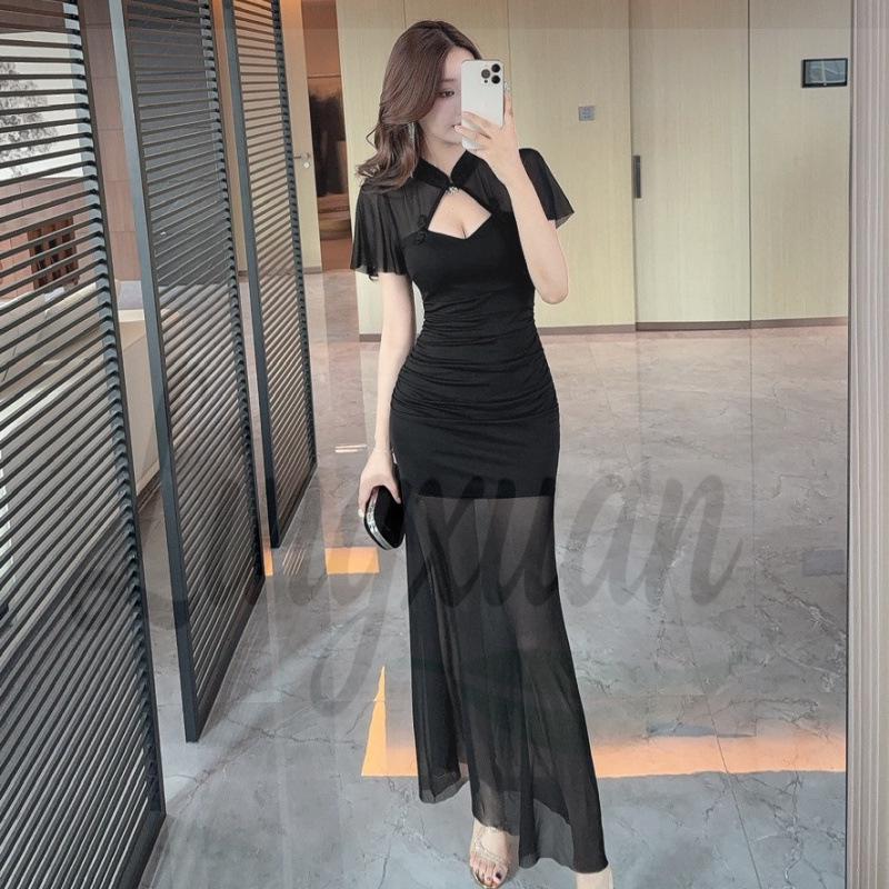 Elegant Mesh Patchwork Qipao Bodycon Gown with Slit