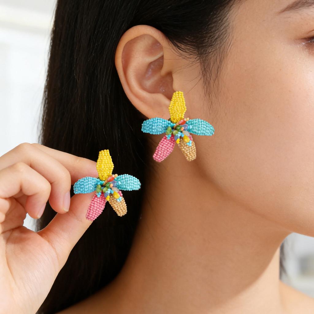 Summer color dopamine beaded flower stud earrings hand-woven three-dimensional petal design temperament earrings