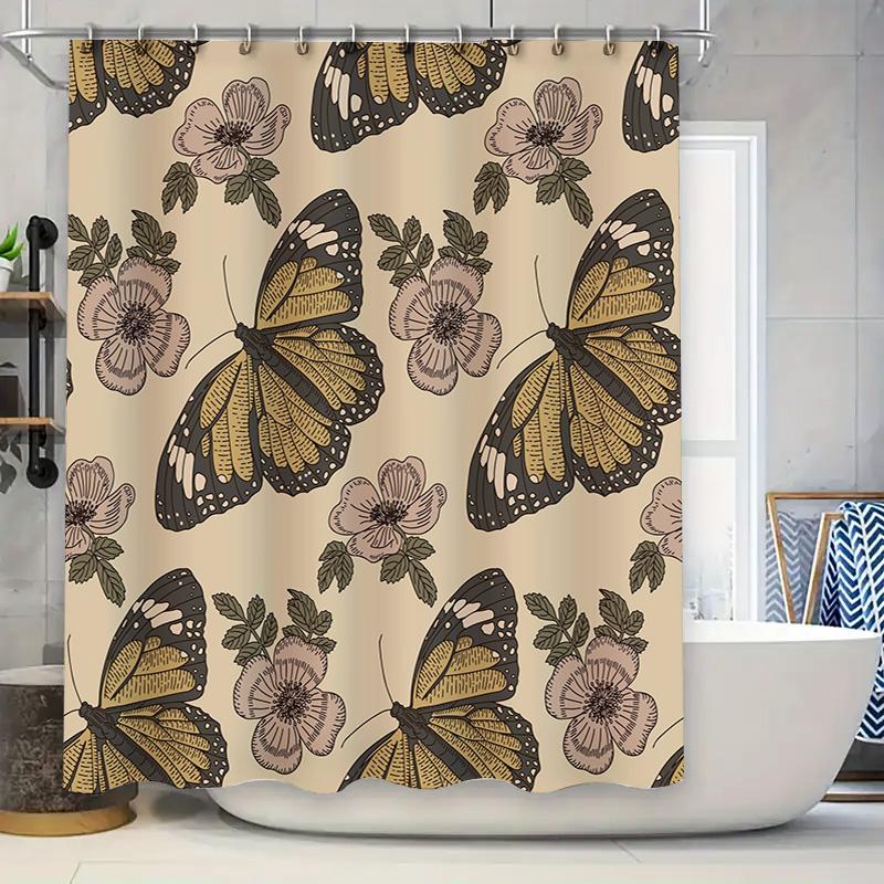 Vintage Butterfly Flower Shower Curtain Decor for Bathrooms Printed Polyester Fabric with Hooks Included (Tan Black)
