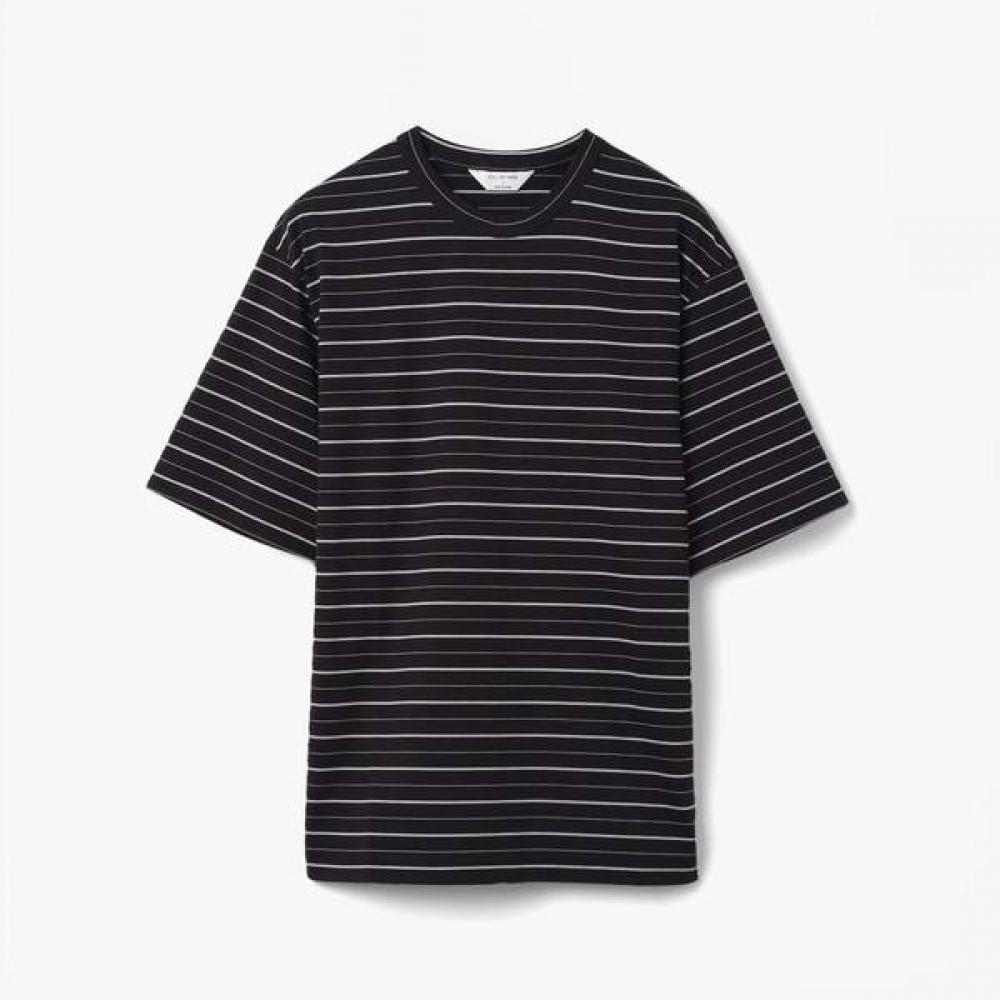 The STRIPED T-SHIRT from STILL BY HAND features a classic striped design. With its luxurious black color, it pairs well with various styles, offering comfort and versatility.