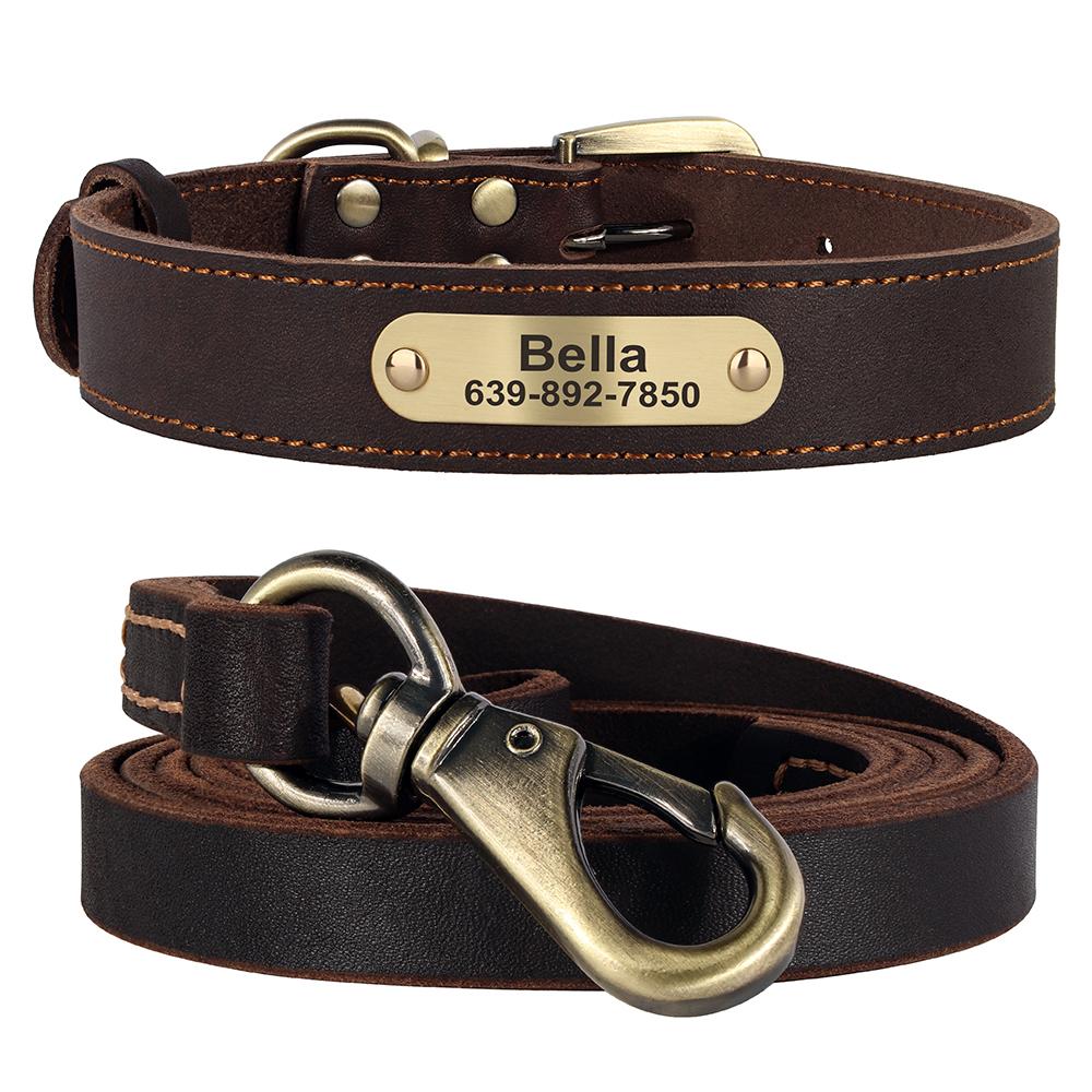Personalized Dog Collar Leash Set Durable Genuine Leather Dog Collars Engraved Pet ID Necklace With Lead For Small Large Dogs