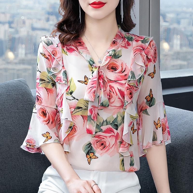 Middle-aged Loose Chiffon Shirt Women's Short-sleeved New Fashion Floral Tops Age-reducing Shirts