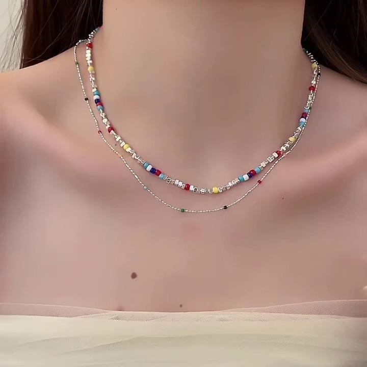Dopamine Color Beaded Triangle Crushed Silver Necklace Women'S Light Luxury Niche Clavicle Chain Neck Chain Accessories