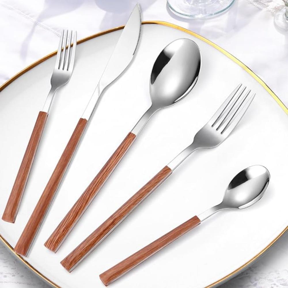 16/24/30Pcs Stainless Steel Imitation Wooden Handle Cutlery Set Silver Dinnerware Knife Spoon Fork Tableware Set