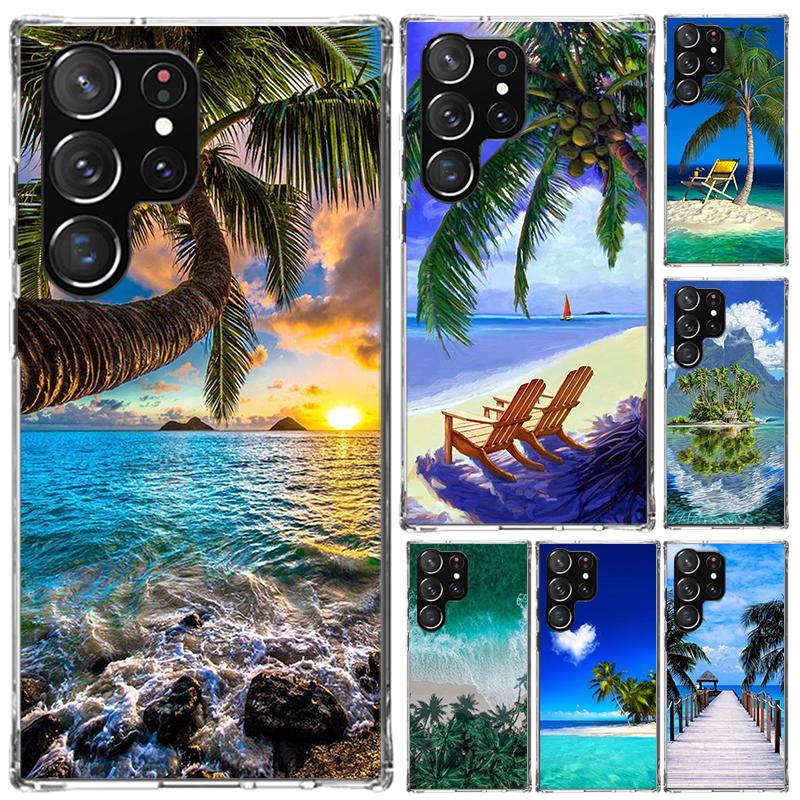 Letni Zachód Słońca nad Morzem z Palmą Etui na Telefon dla Samsung Galaxy S26 S24 S23 Ultra S25 Edge S22 S21 Plus S20 FE + Miękki Nadruk Osłona