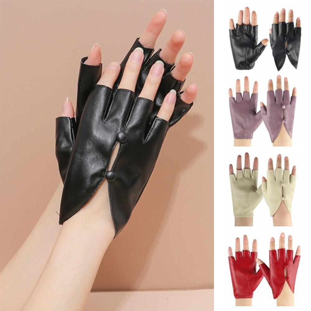 PU Leather Women Leather Gloves Button Hole Leather Gloves Half Finger Gloves Mitten Accessories