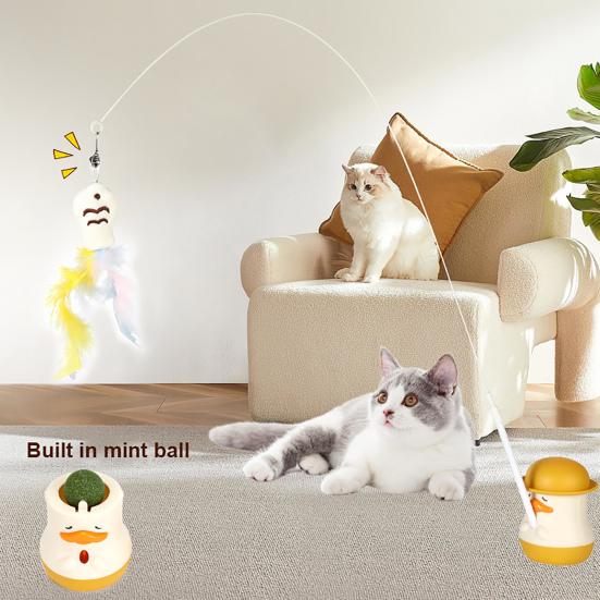 Interactive Cat Teaser Stick Cat Toy with Feathered Fish Interchangeable Teaser Heads 360-Degree Rotating Duck Base Detachable Teaser Wand for Small
