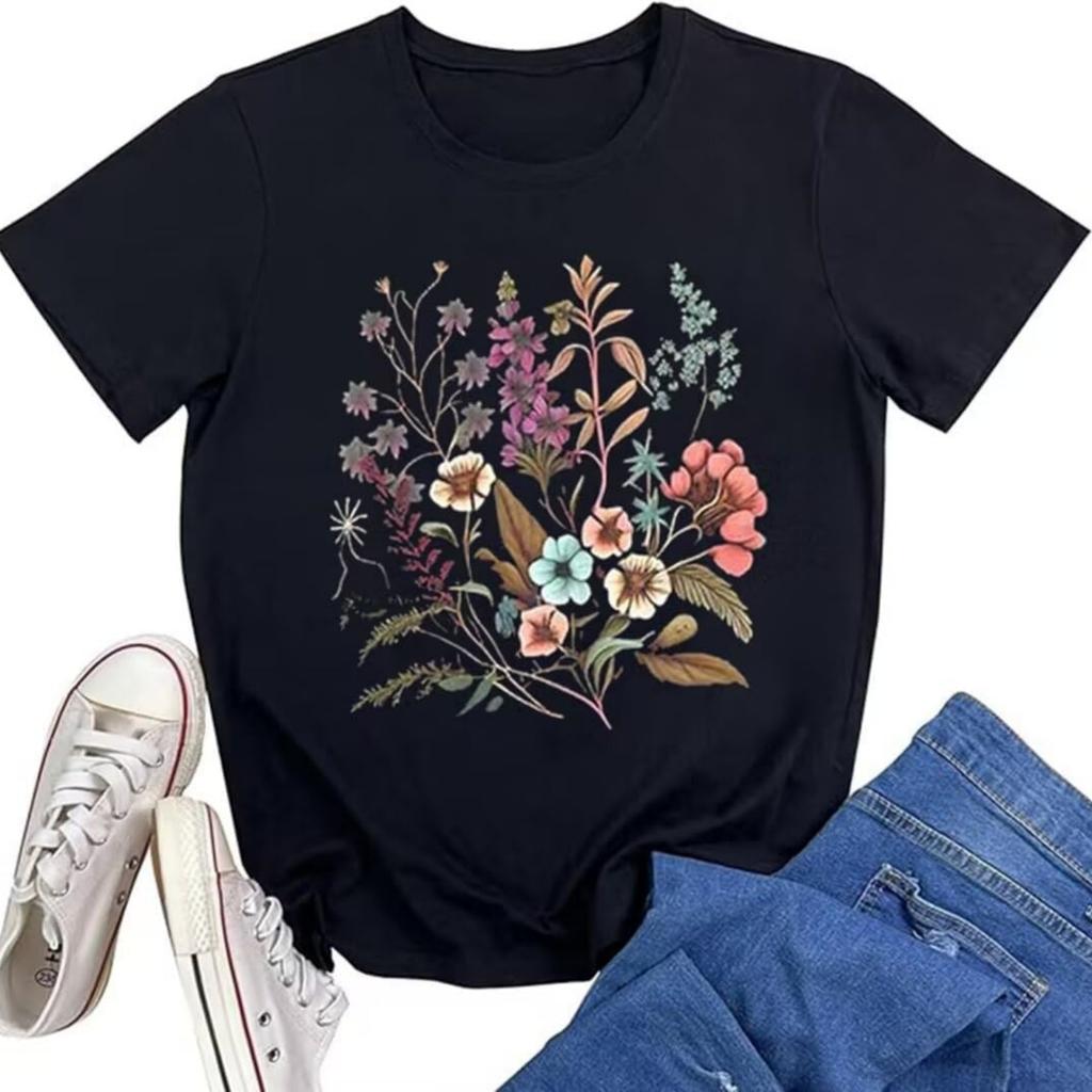 Vintage Boho Floral T Shirt for Women Cute Colorful Wildflowers Graphic Short Sleeve Fashion Girl Botanical Tee Tops