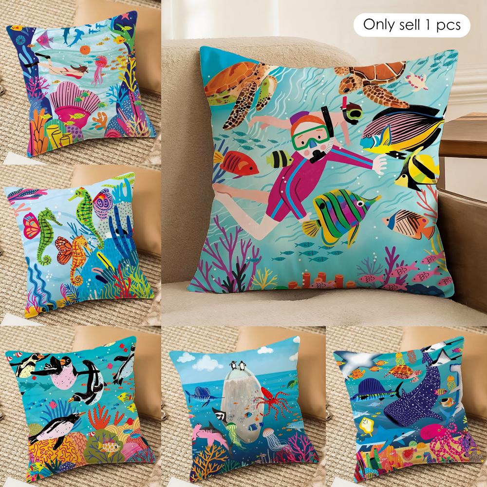Marine Animals Summer Ins Cushion Cover Silky Short Plush Invisible Zipper Dustproof Sofa Pillow Case For Home Decor