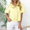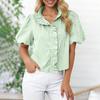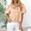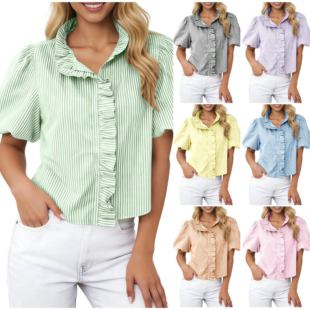 Damska stylowa koszula casual w paski z marszczonymi krótkimi rękawami i stojącym kołnierzykiem Luźny top T-shirt