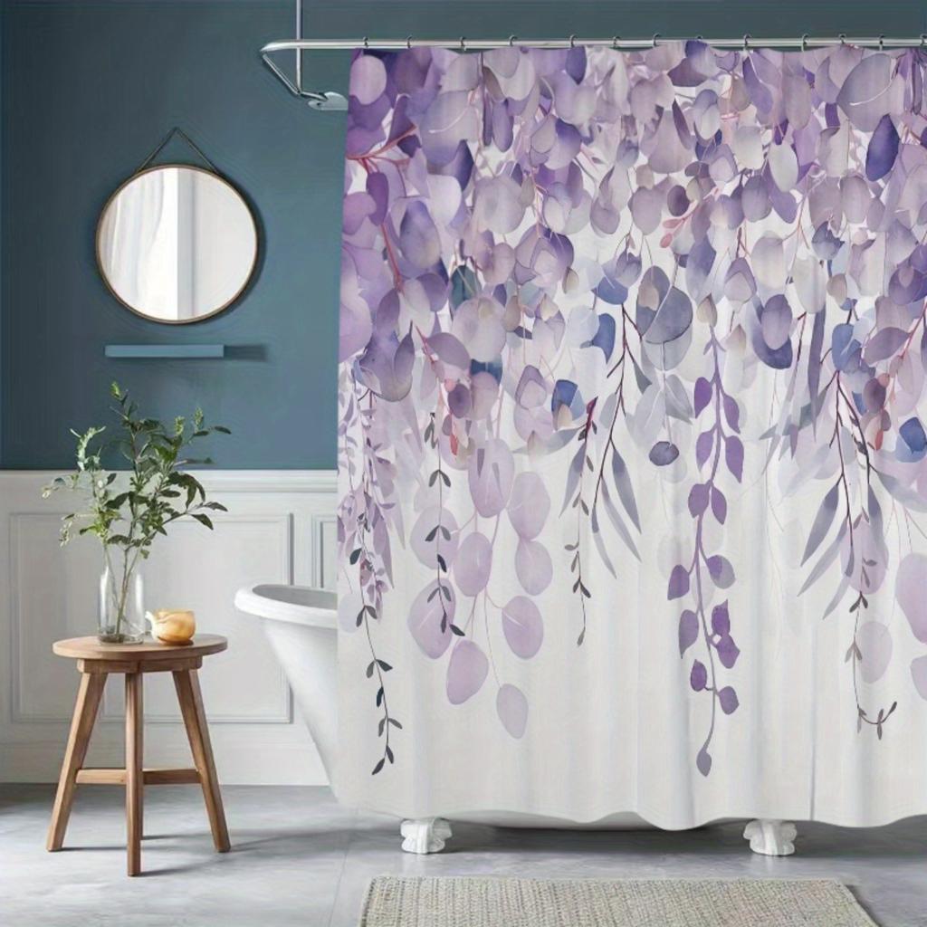 1pc Purple Leaf Print Watercolor Shower Curtain - Floral Botanical Bathroom Decor with Hooks, Machine Washable Polyester Fabri