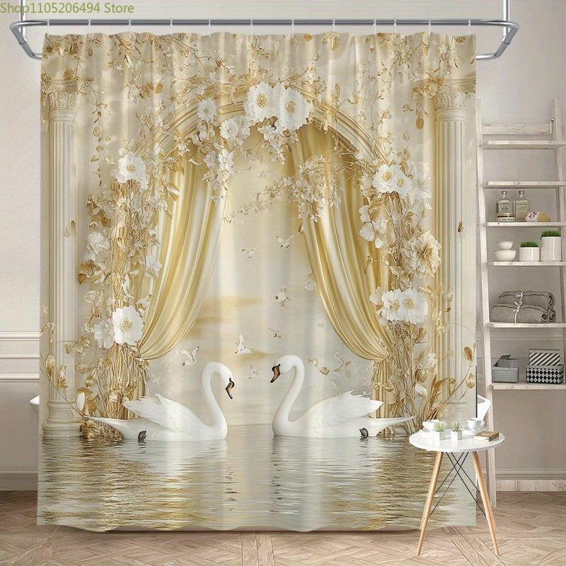 1pc Elegant White Swans in Reflective Pool Shower Curtain with Golden Floral Arrangements & Romantic Classical Architecture -