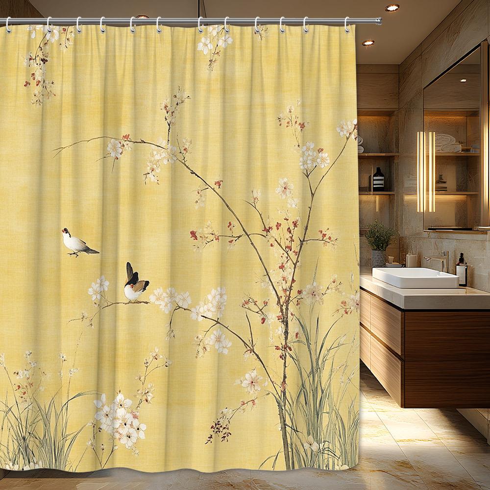 1pc Japanese Ukiyo-e Birds and Blossoms Shower Curtain - Ethereal Tranquil Scene with Small Birds and Flowering Branches, Poly
