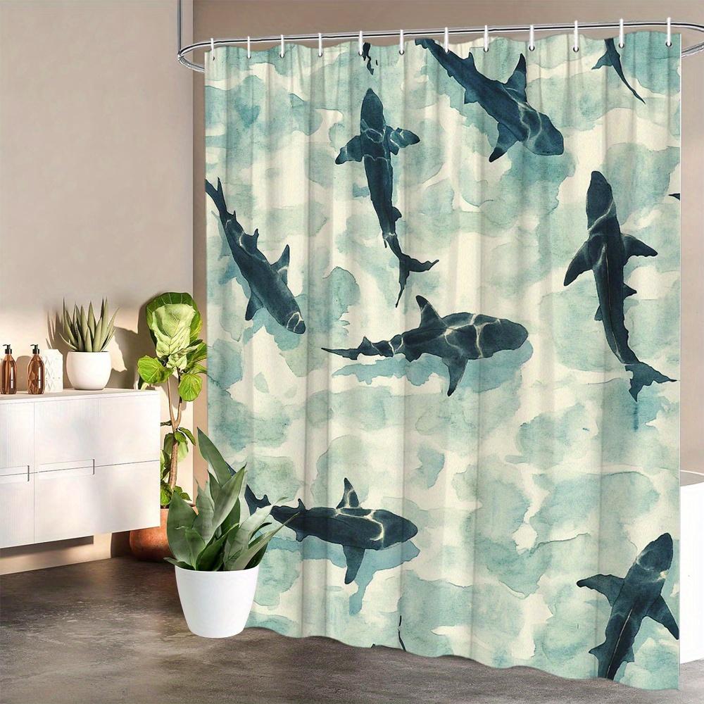 Shark Watercolor Shower Curtain 1pc – Swimming Sharks in Turquoise Ocean, Marine Art Bath Curtain for Bold Home Decor