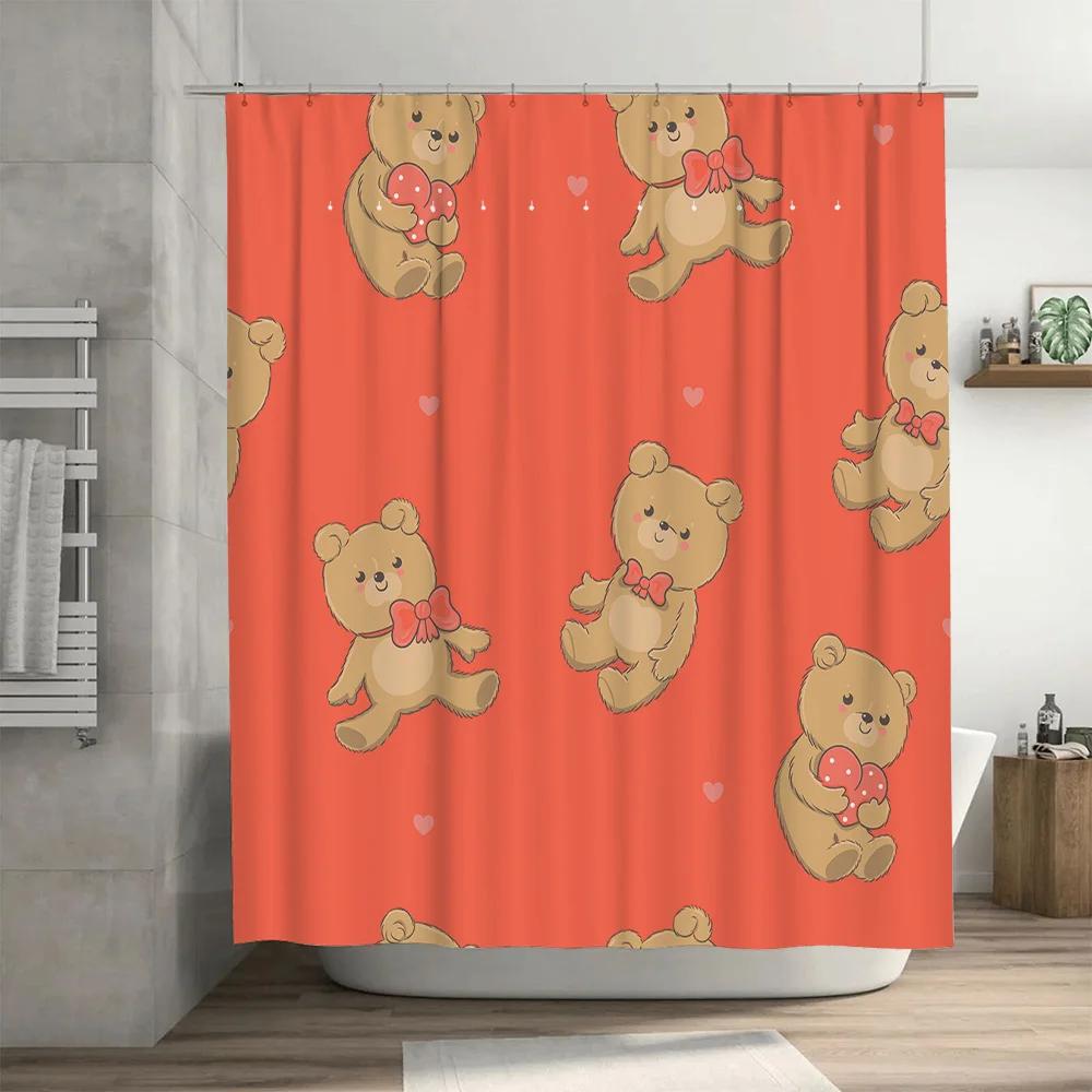 Whimsical Red Bath Shower Curtain with Adorable Teddy Bears Holding Hearts Decorate Your Bathroom with a Touch of Sweetness