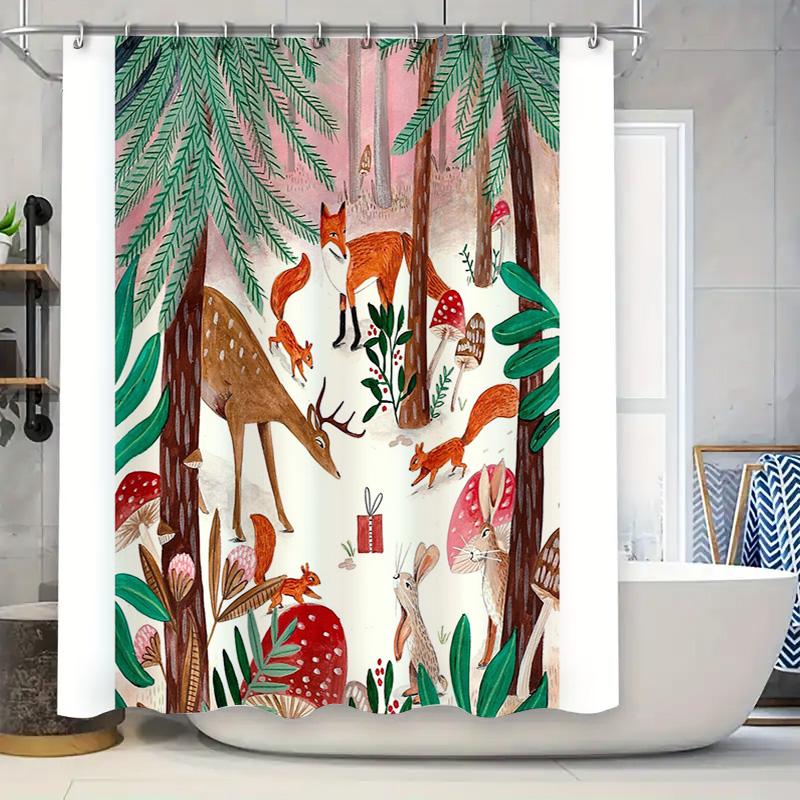 Forest Animals Shower Curtain Woodland Deer Fox Rabbit Nature Bathroom Decor Vintage Rustic Home Decor Farmhouse Style Backdrop
