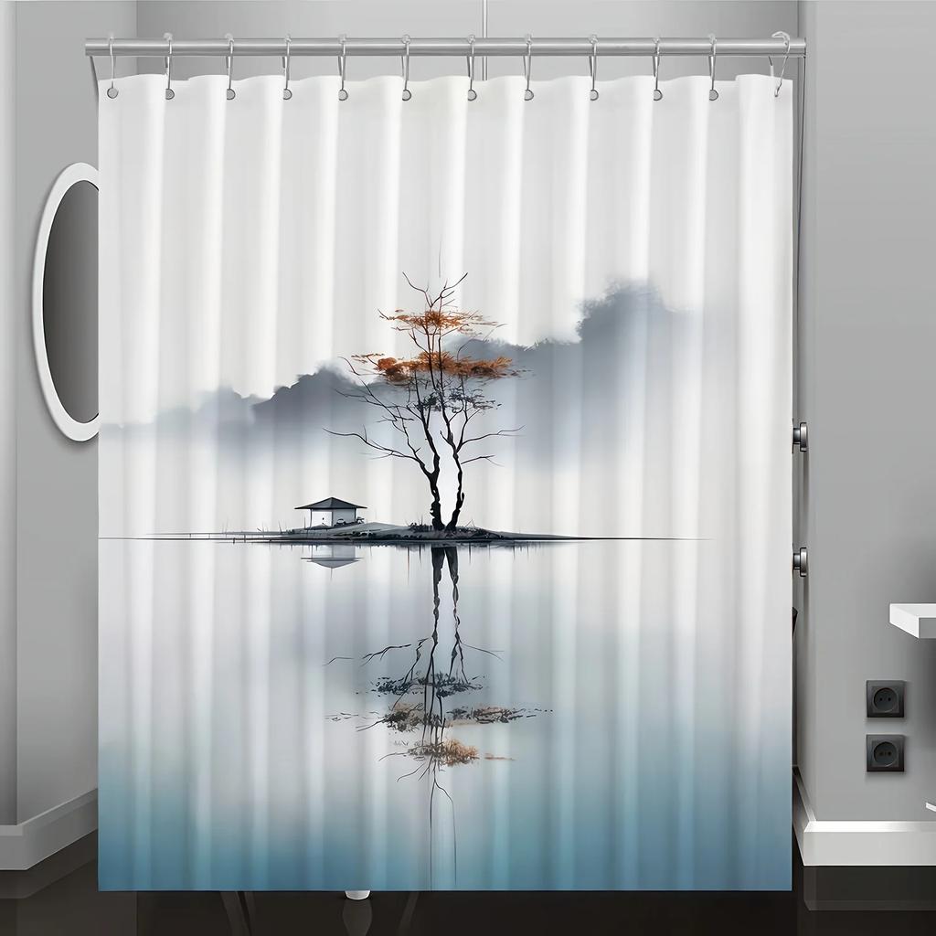 1pc Chinese Landscape Ink Painting Pattern Digital Printing Shower Curtain Bathroom Home Decor with Free Hook Machine Washable