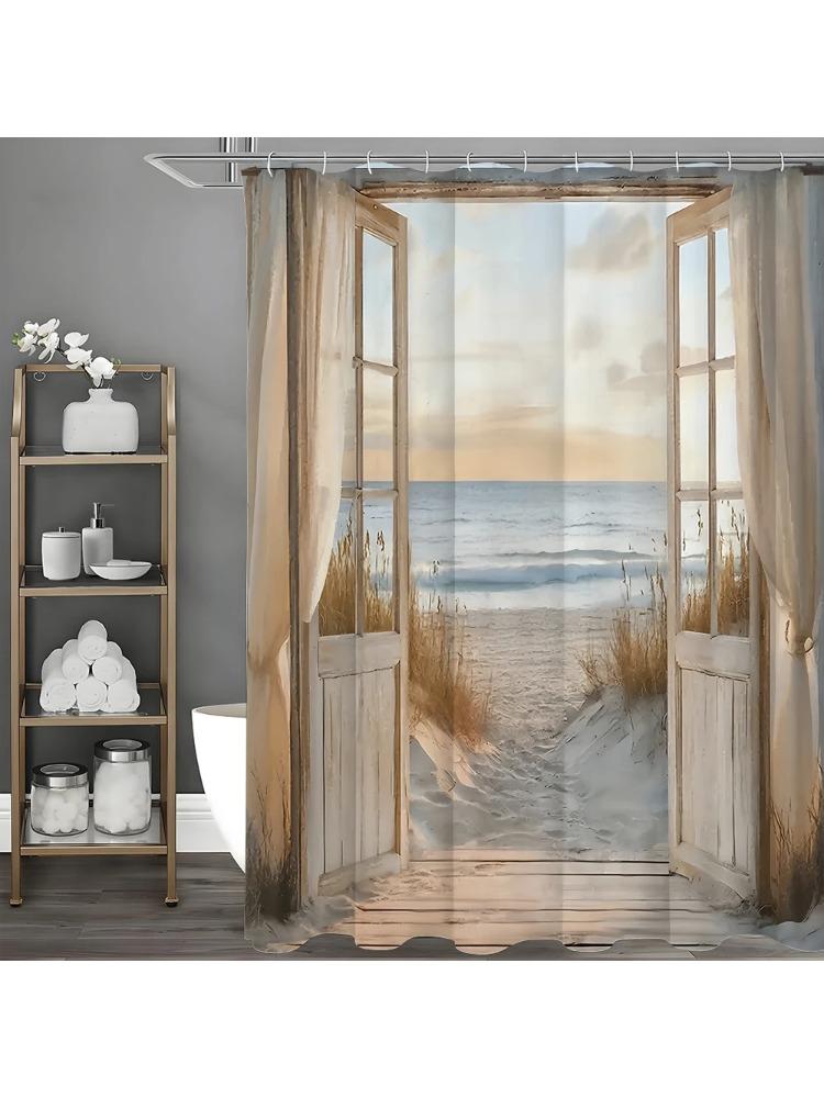 Ocean Beach Drewniane Drzwi Botaniczna Zasłona Prysznicowa, Dekoracyjna Zasłona Prysznicowa do Łazienki, Wodoodporna Zasłona Prysznicowa z Haczykami