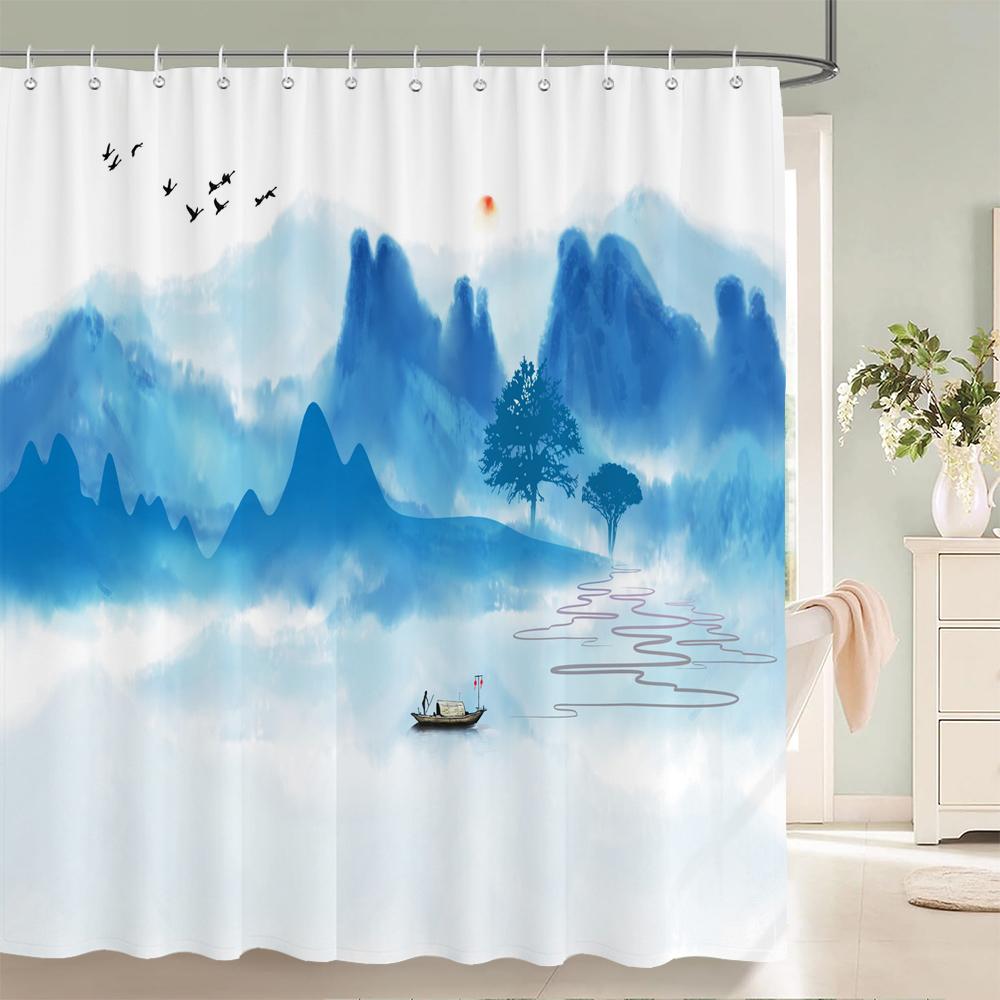 Chiński styl tuszu krajobrazowy zasłona prysznicowa malowniczy wzór Wodoodporna tkanina zasłona łazienkowa zmywalna Zasłony łazienkowe Wielorozmiarowe